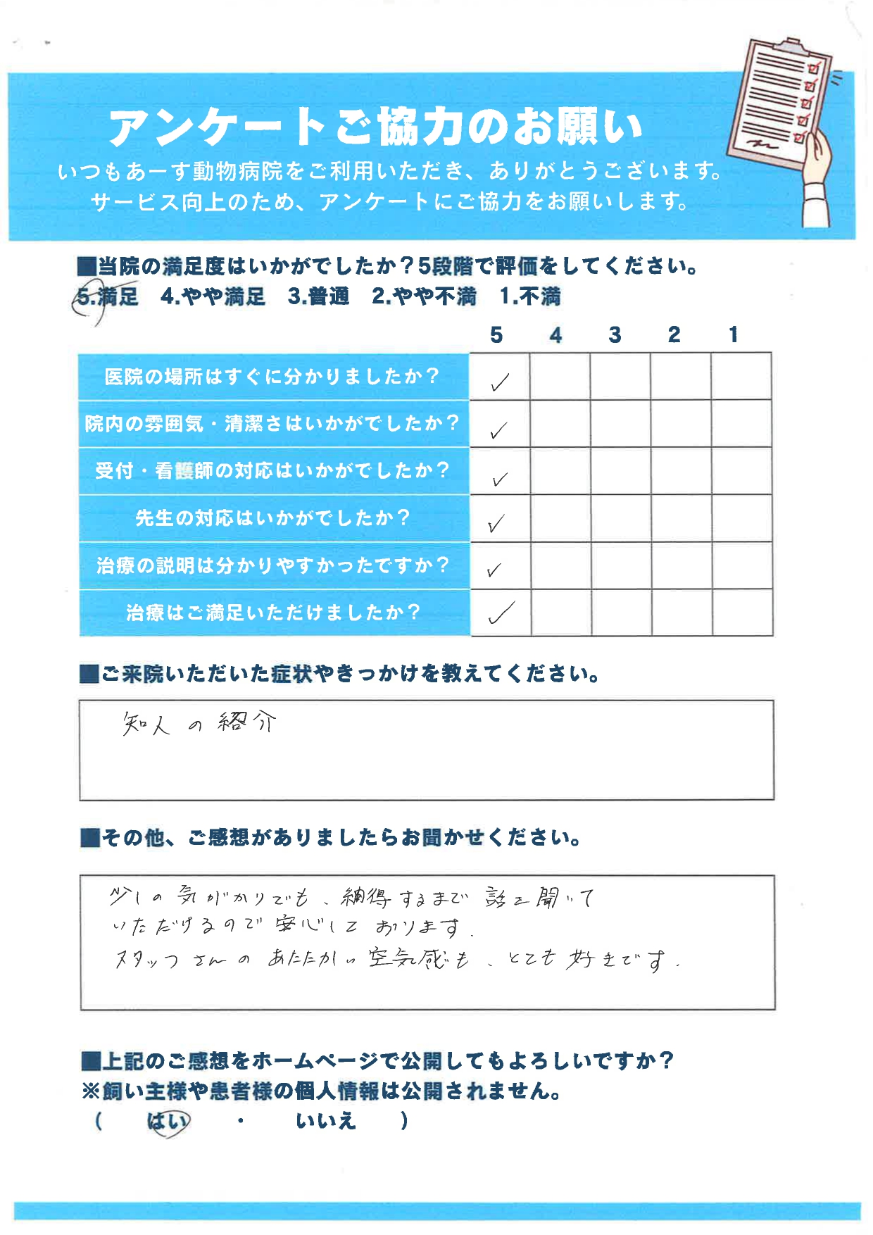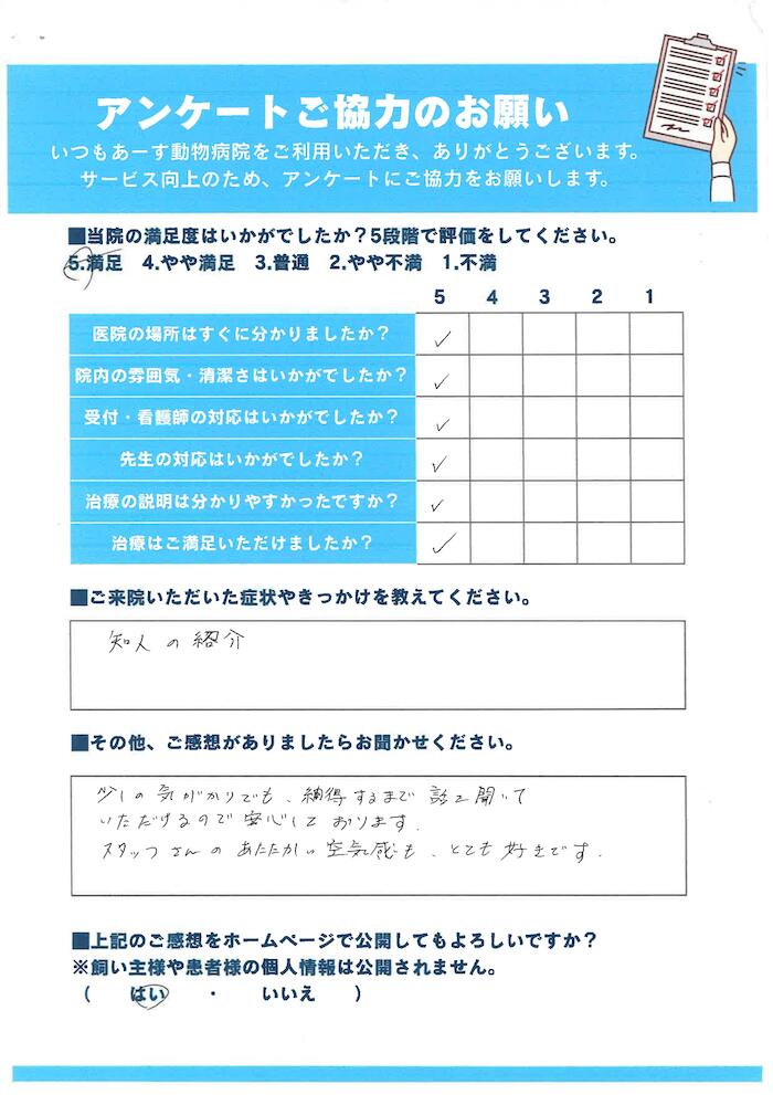 少しの気がかりでも、納得するまで話を聞いていただけるので、安心しております|八潮市のあーす動物病院 NEW